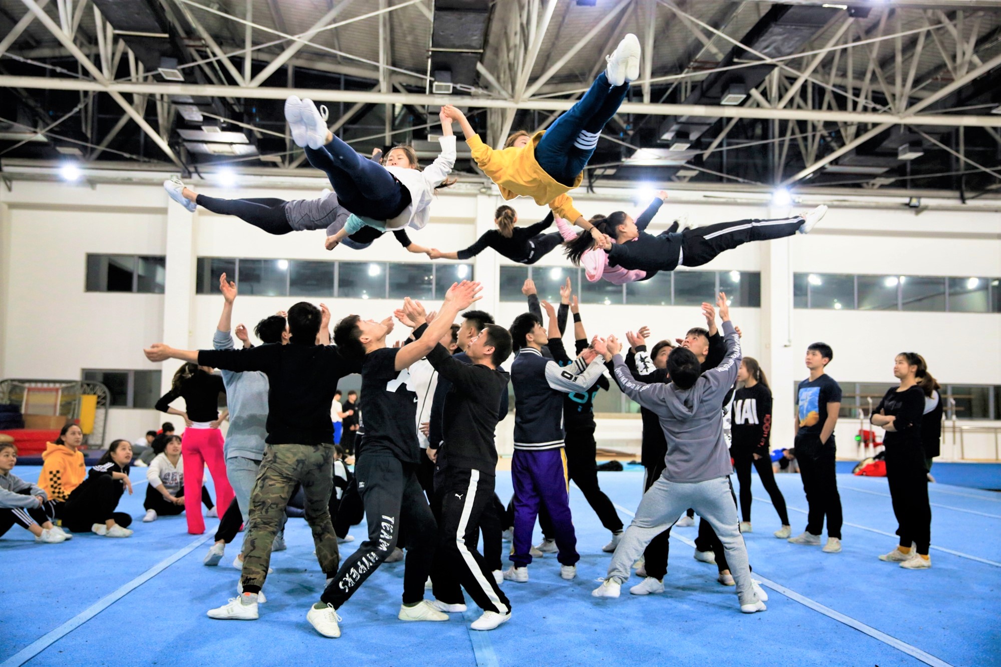 編排考驗著運動員的綜合能力,不僅需要把各類技術動作本身學懂弄通,還必須考慮如何在技術展現、團隊配合的同時,將節奏感、藝術性、一致性等元素淋漓盡致地展現。正是這一過程,最大程度調動了同學們學習技術技巧、深入研究項目的積極主動性。訓練間隙,隊員們往往一邊按摩壓腿,一邊討論如何配合著音樂改編動作,熱火朝天。