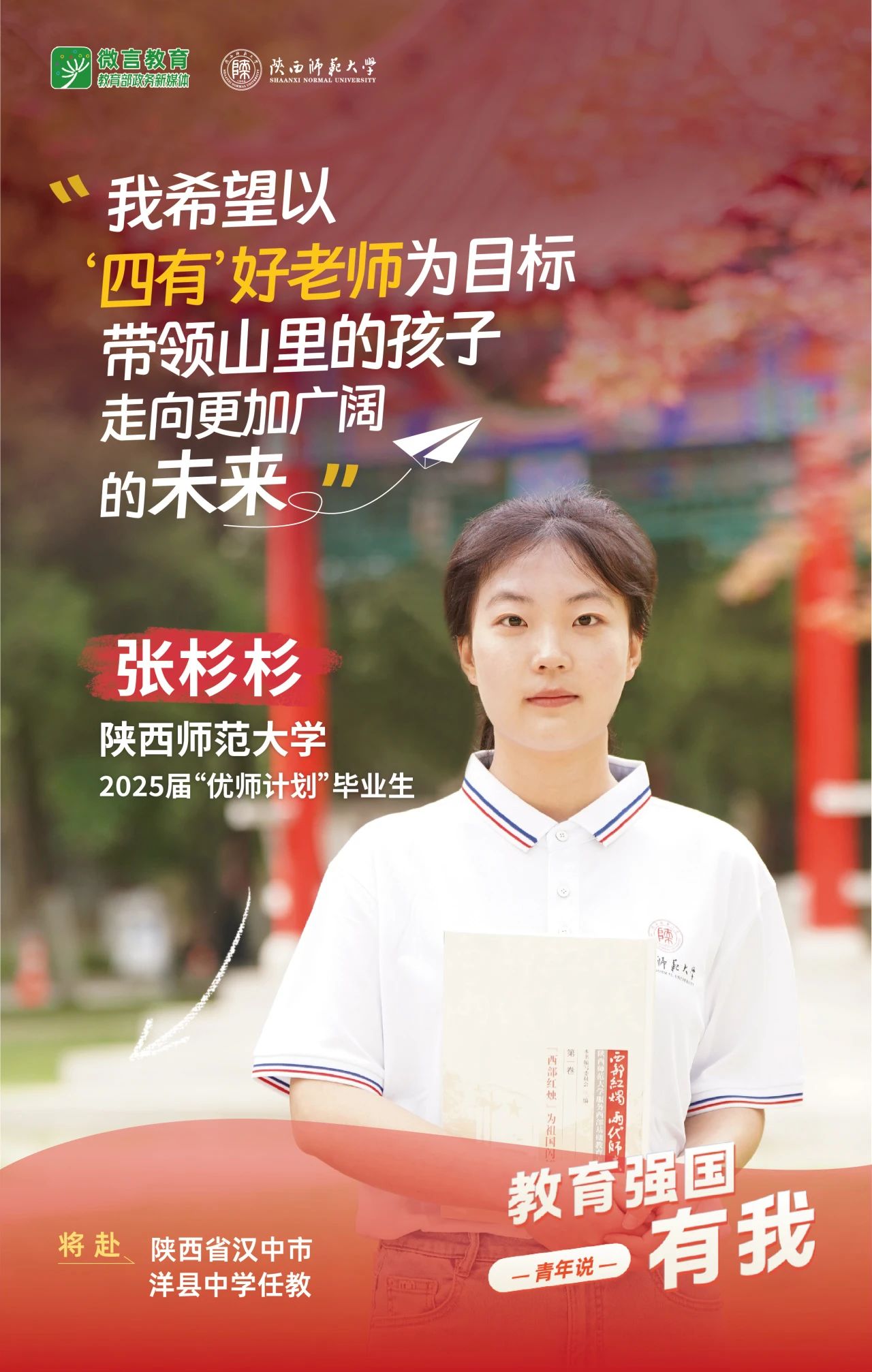 我是陜西師范大學2025屆“優師計劃”畢業生張杉杉,我將赴陜西省漢中市洋縣中學任教。我希望以“四有”好老師為目標,帶領山里的孩子走向更加廣闊的未來。