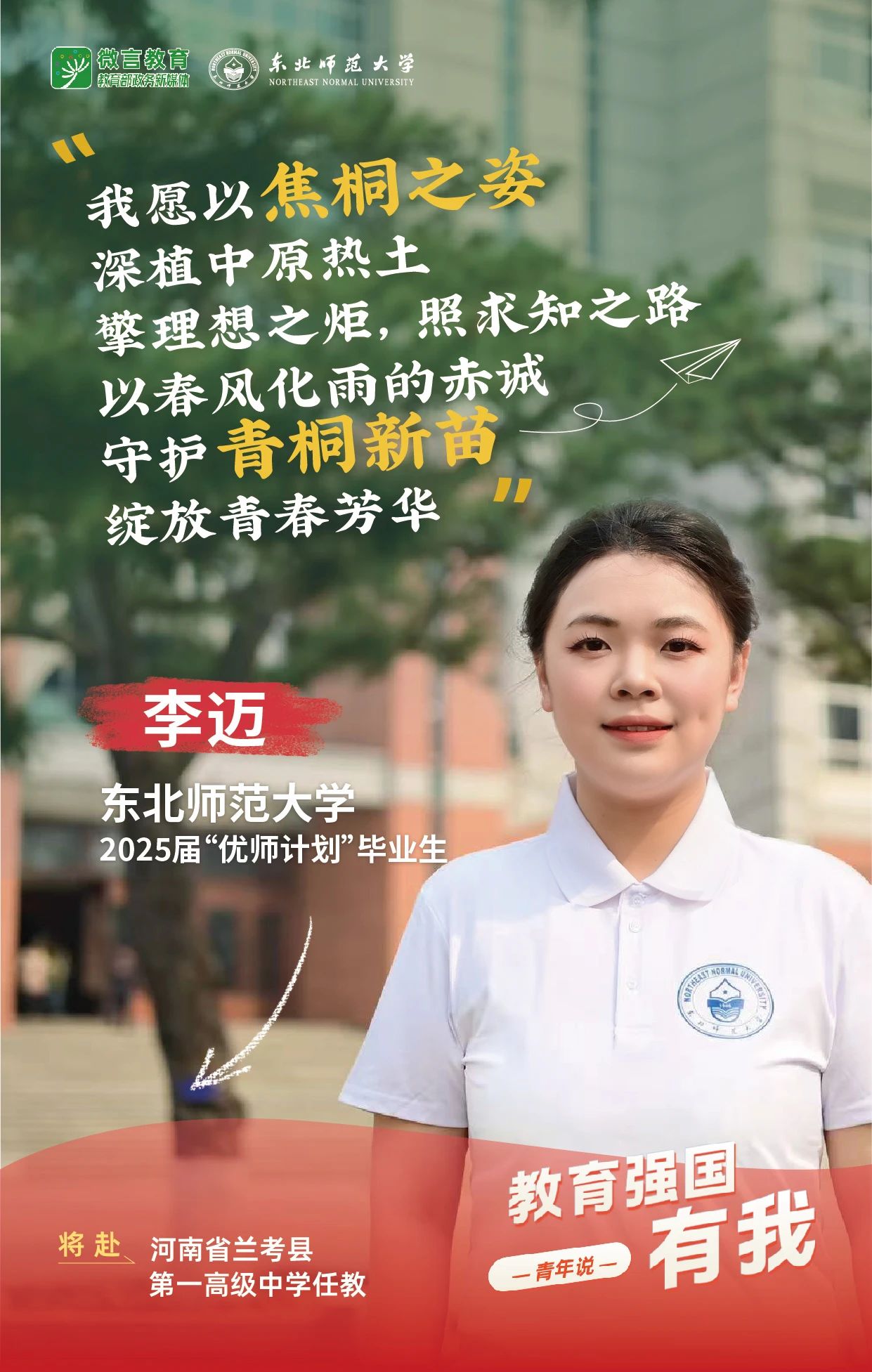 我是東北師范大學2025屆“優師計劃”畢業生李邁,我將赴河南省蘭考縣第一高級中學任教。我愿以焦桐之姿,深植中原熱土擎理想之炬,照求知之路;以春風化雨的赤誠守護青桐新苗,綻放青春芳華。