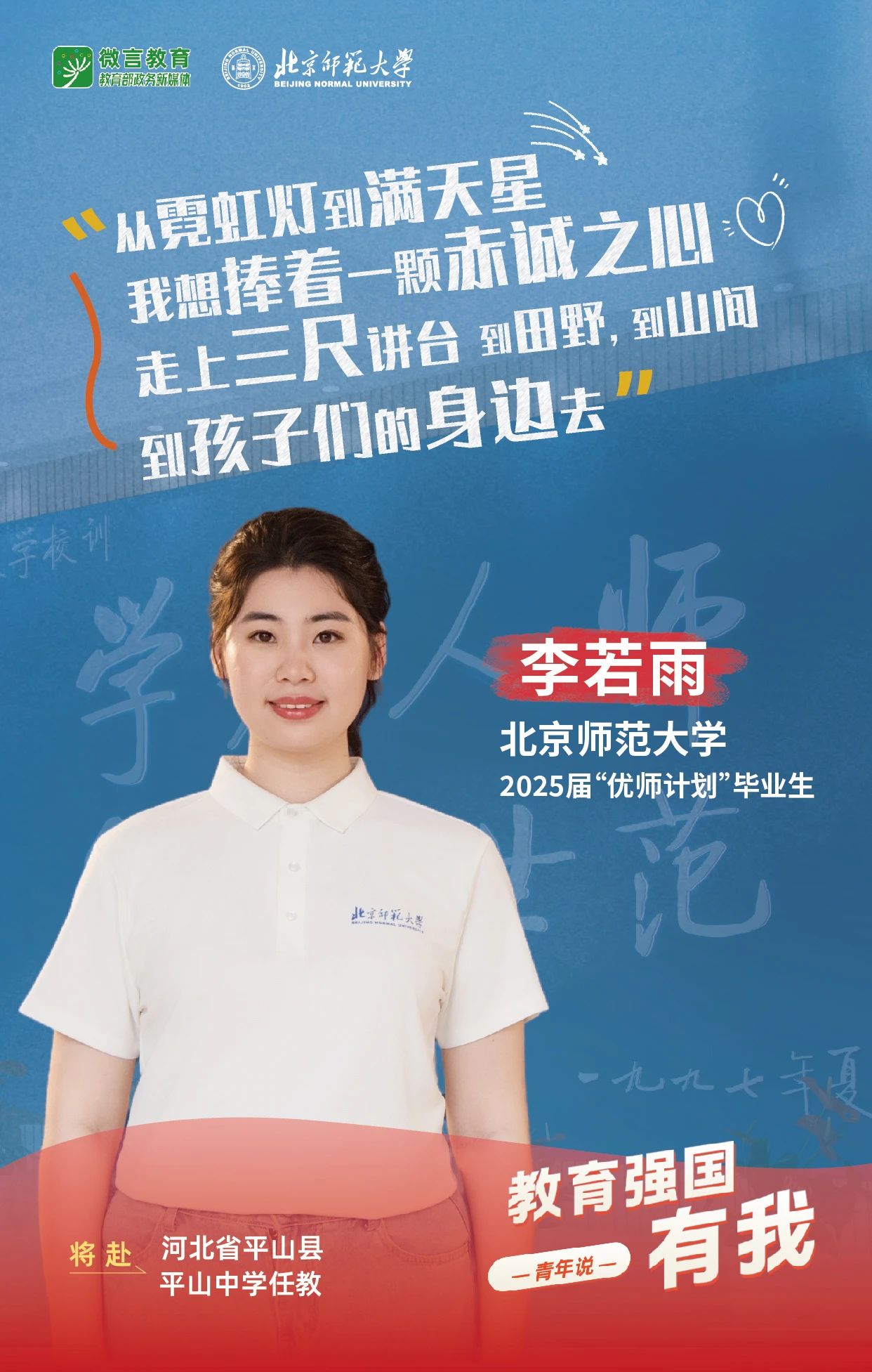 我是北京師范大學2025屆“優師計劃”畢業生李若雨,我將赴河北省平山縣平山中學任教。從霓虹燈到滿天星,我想捧著一顆赤誠之心走上三尺講臺,到田野,到山間,到孩子們的身邊去。