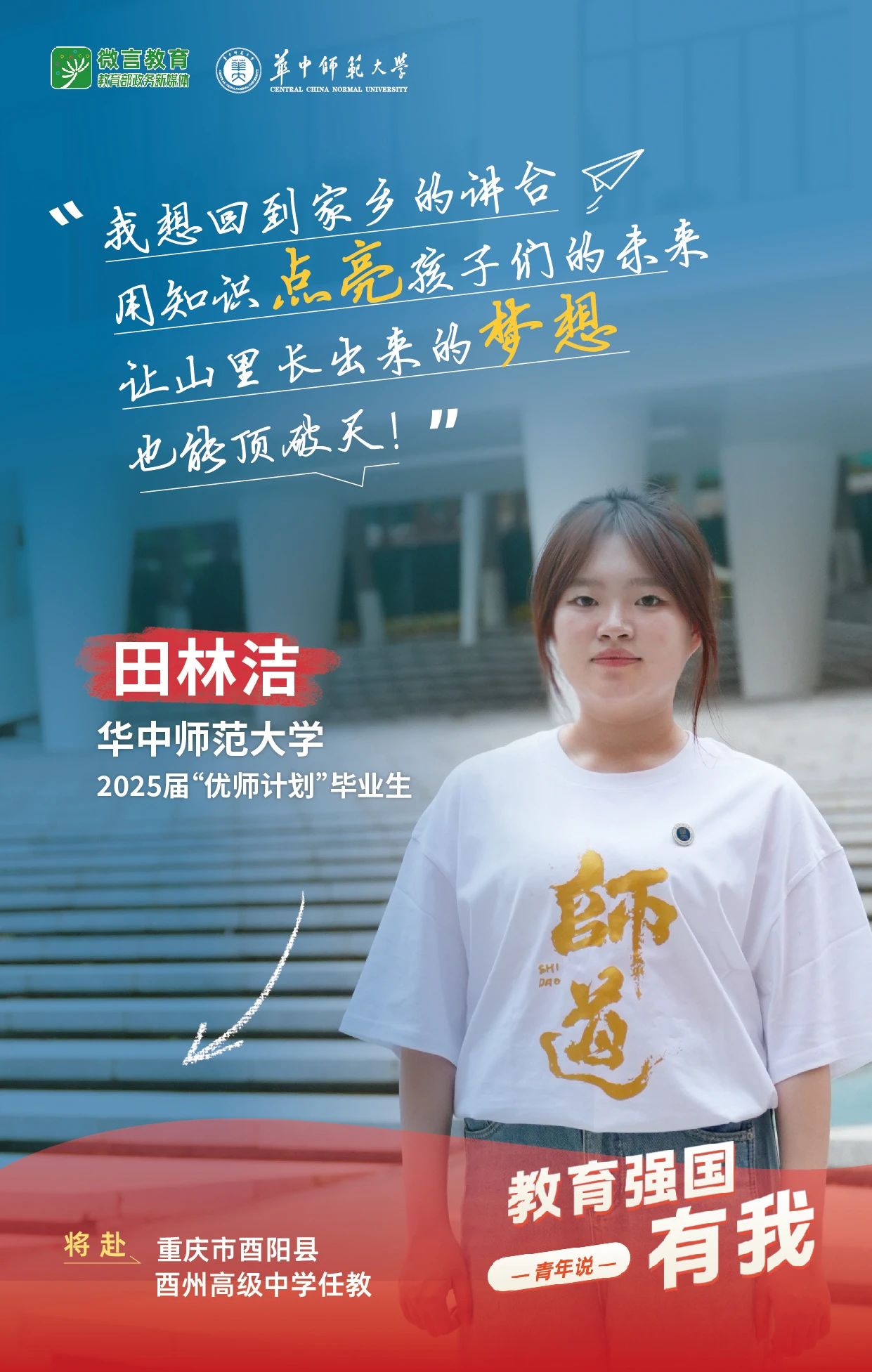 我是華中師范大學2025屆“優師計劃”畢業生田林潔,我將赴重慶市酉陽縣酉州高級中學任教。我想回到家鄉的講臺,用知識點亮孩子們的未來,讓山里長出來的夢想也能頂破天!