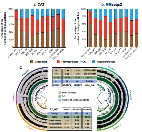面對這個棘手的問題,研究團隊打破常規(guī),采用逆向思維,找到了最關(guān)鍵的解決思路——通過短讀長序列回貼、基因組覆蓋度分析、序列重疊群聚類和分類譜分析發(fā)現(xiàn)涅爾德古菌基因組同時包含阿斯加德古菌及其姐妹超門TACK古菌的序列成分(圖2)。例如在涅爾德古菌基因組中,大約24-60%的重疊群(Contigs)屬于TACK古菌,而僅3-35%的重疊群屬于阿斯加德古菌。
