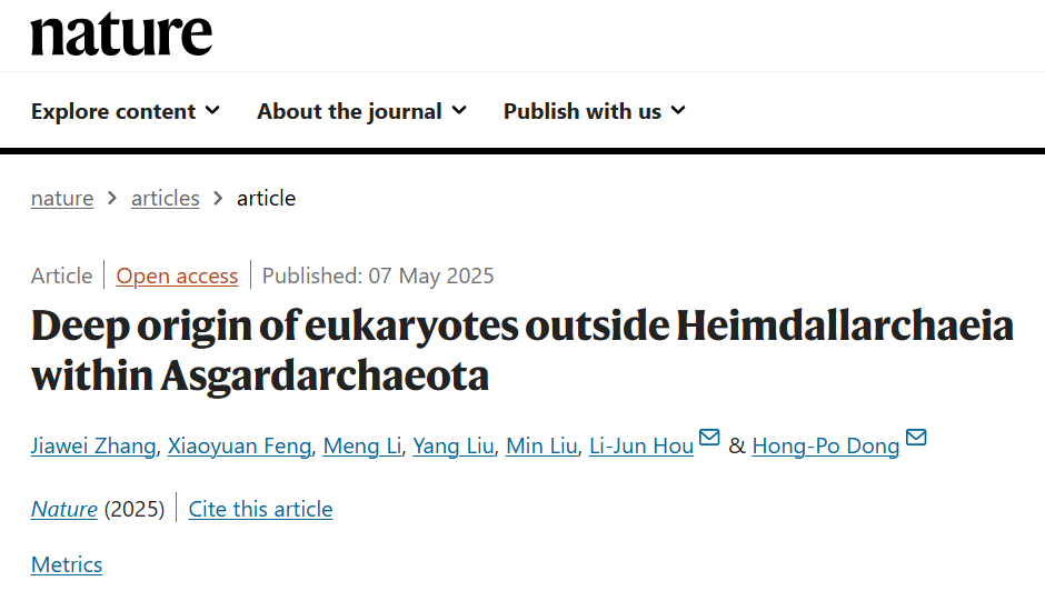 5月7日,華東師范大學(xué)河口海岸全國重點實驗室董宏坡研究員和侯立軍研究員團隊聯(lián)合深圳大學(xué)研究團隊在國際頂級期刊《自然》發(fā)表了最新研究成果,挑戰(zhàn)了此前關(guān)于真核生物祖先起源于阿斯加德古菌海姆達爾綱(Heimdallarchaeia)內(nèi)部,作為霍德爾目(Hodarchaeales)姐妹的假說。該研究將真核生物起源位置精確定位為海姆達爾綱的姐妹類群,這一發(fā)現(xiàn)表明真核細胞的起源時間可能約在27.2億年前,早于地球大氧氣事件,這為理解真核細胞形成機制提供重要的線索。