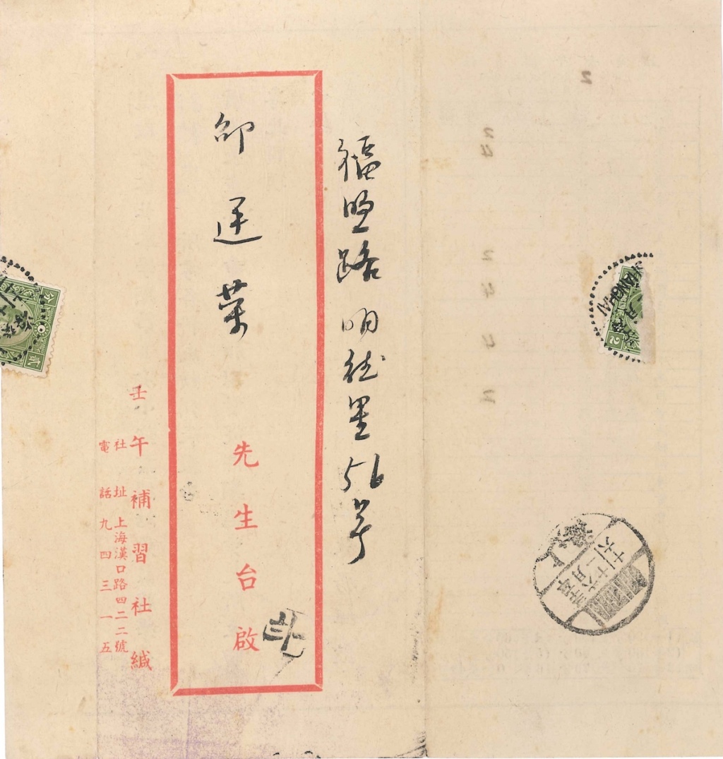當(dāng)然,這一成績(jī)單上還有幾處可注意之處:一者是邵貽裘在光華高中所上具體課程及成績(jī),他們分別是國(guó)文(2)、英文(4)、大代數(shù)(2)、復(fù)習(xí)數(shù)學(xué)(4)、物理(4)、西洋文化(2),從成績(jī)單上的說(shuō)明可知,學(xué)生的成績(jī)等第對(duì)應(yīng)的分?jǐn)?shù)分別是1等:90至100,2等:80至89,3等:70至79,4等:60至69。同時(shí),這一成績(jī)單的外封上寫(xiě)有“福煦路明德里56號(hào)邵廷榮先生臺(tái)啟”字樣,福煦路明德里56號(hào)無(wú)疑是邵貽裘的家庭住址,而邵廷榮當(dāng)是邵貽裘的父親。此外,這封成績(jī)單寄出的時(shí)間為1942年6月,其外封上印有壬午補(bǔ)習(xí)社的地址是“漢口路422號(hào)”,此處的“漢口路422號(hào)”實(shí)為光華大學(xué)在抗戰(zhàn)中另一處寄居之地——上海證券大樓。